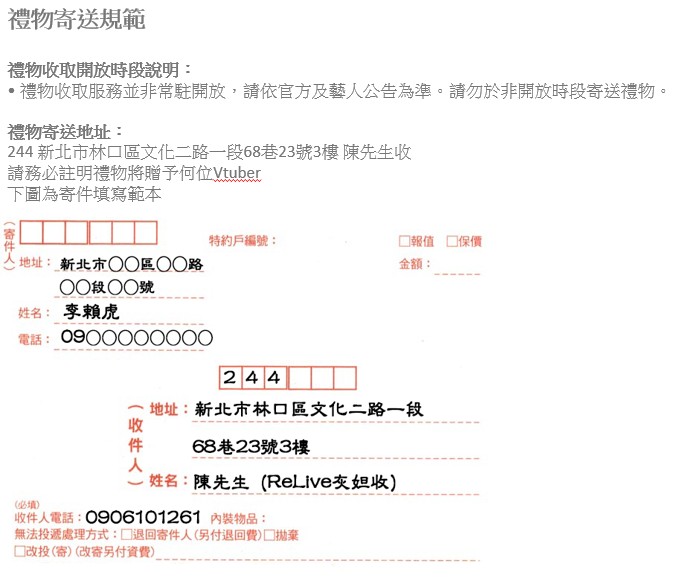 - 禮物寄送請於寄件資訊中、外包裝或禮物小卡內填寫要贈與何位Vtuber,若無填寫,營運方將視為禮物贈與公司。